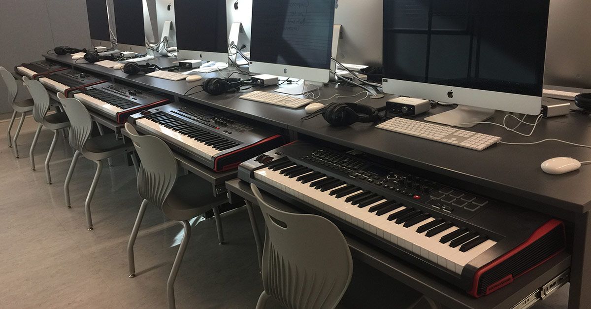 The school's recording studio allows students to learn live recording and sound reinforcement. It is outfitted with Avid Pro Tools and a lab with Novation MIDI keyboard controllers as well as a production room and isolation booth set up like a professional workspace.