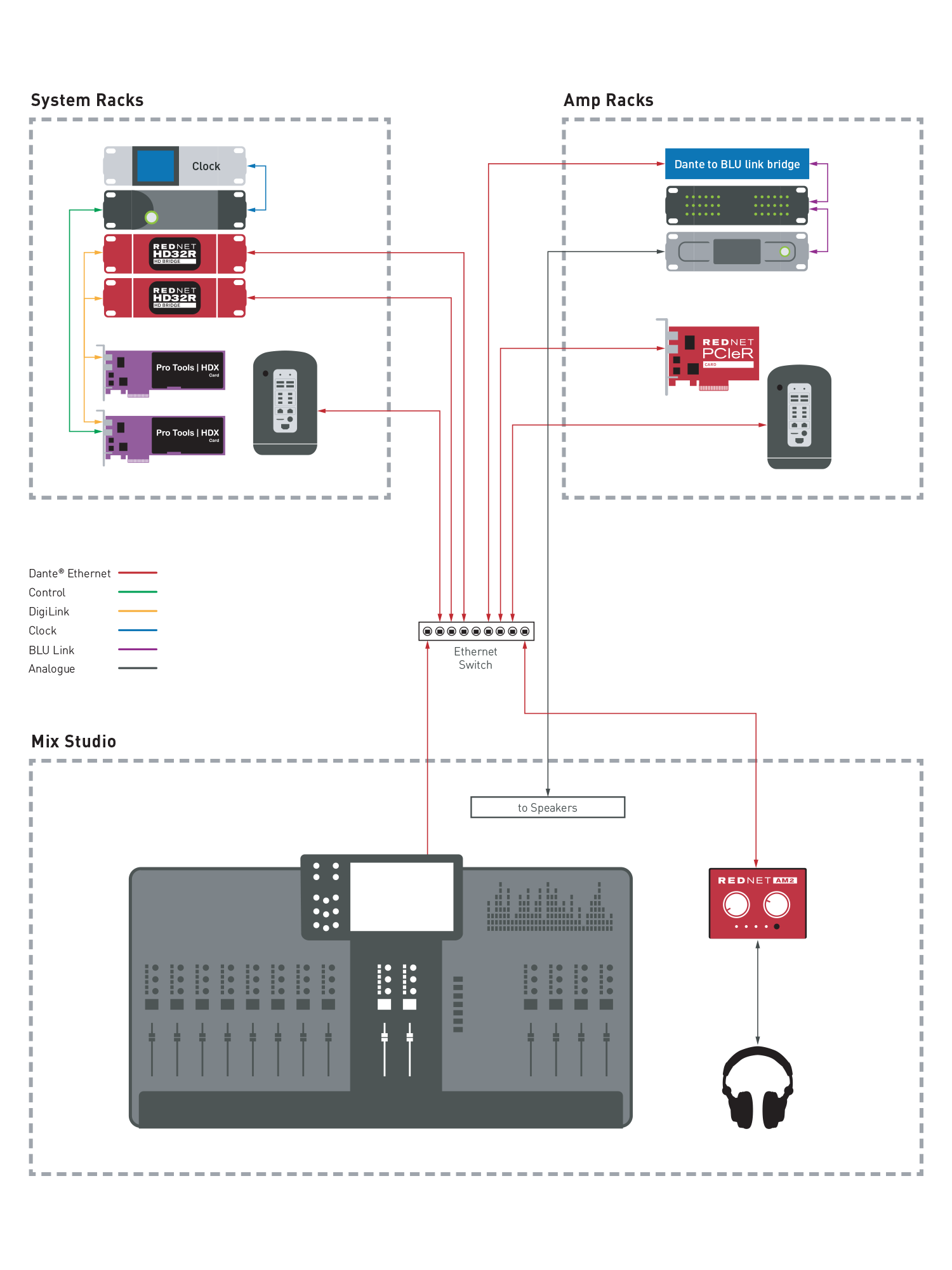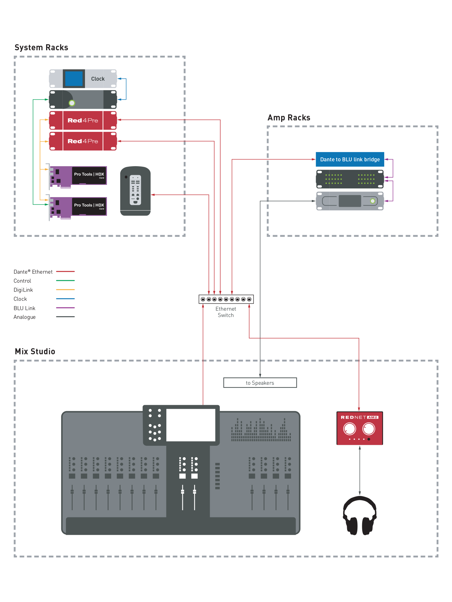 Cinematic Media's six new stages, which are set up for sound design, sound editorial, pre-dubbing, and mixing, each feature a pair of Focusrite RedNet HD32R 32-channel HD Dante network bridges and Red 4Pre 58-In/64-Out Thunderbolt™ 2 and Pro Tools | HD™ compatible audio interfaces (one per room). RedNet AM2 stereo audio monitoring units and RedNet X2P 2x2 Dante™ audio interfaces are also available on the stages.
