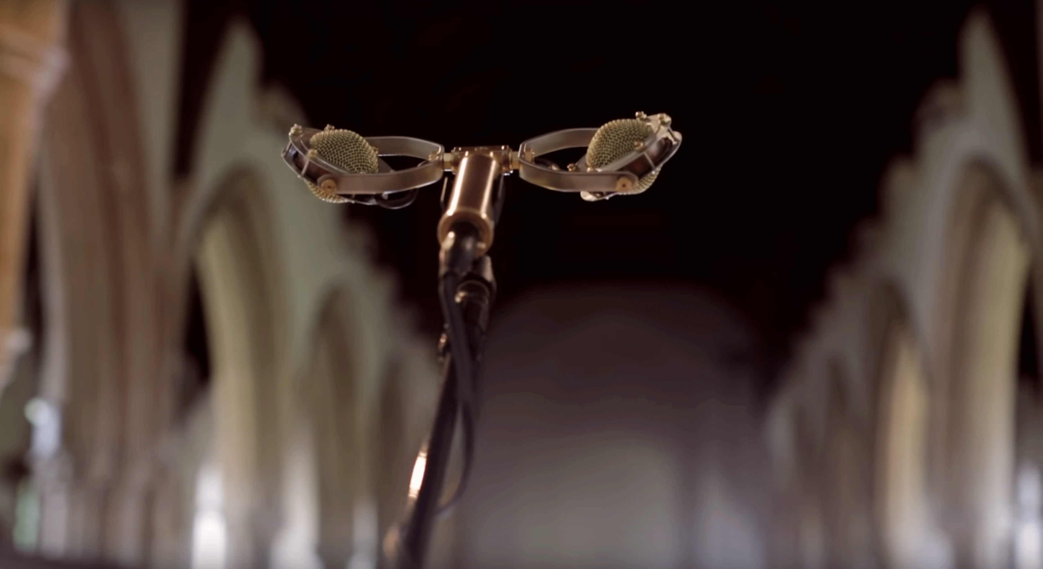 While most attention was given to creating stereo pairs, a mono centre mic, an Ear Trumpet Labs Chantelle, which is visible in many shots throughout the video, was also used. The mic was positioned low to the stone floor, in close proximity to a section covered by a rug, and offset to stage-left to allow the female soprano and alto voices to have proximity dominance over the male tenors and baritones. This is an engineering trick that dates back as long as recording has existed; a crude mono balance can be achieved by placing quieter instruments and voices closest to the mic. Positioning mics in proximity to less-reverberant surfaces — like the rug in this instance —can help to gain a more focussed result.