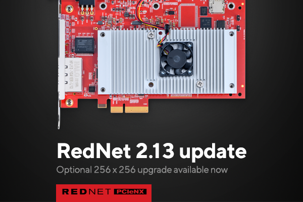 We’re happy to announce the release of RedNet Control v2.13, available now. New firmware for RedNet PCIeNX, bundled with RedNet Control v2.13, enables RedNet PCIeNX card owners to expand audio channel capacity from 128x128 to 256x256 (up to 96kHz) by purchasing a one-time license upgrade from Audinate. Higher sample rates of 176.4/192kHz will remain at 128x128 channels.