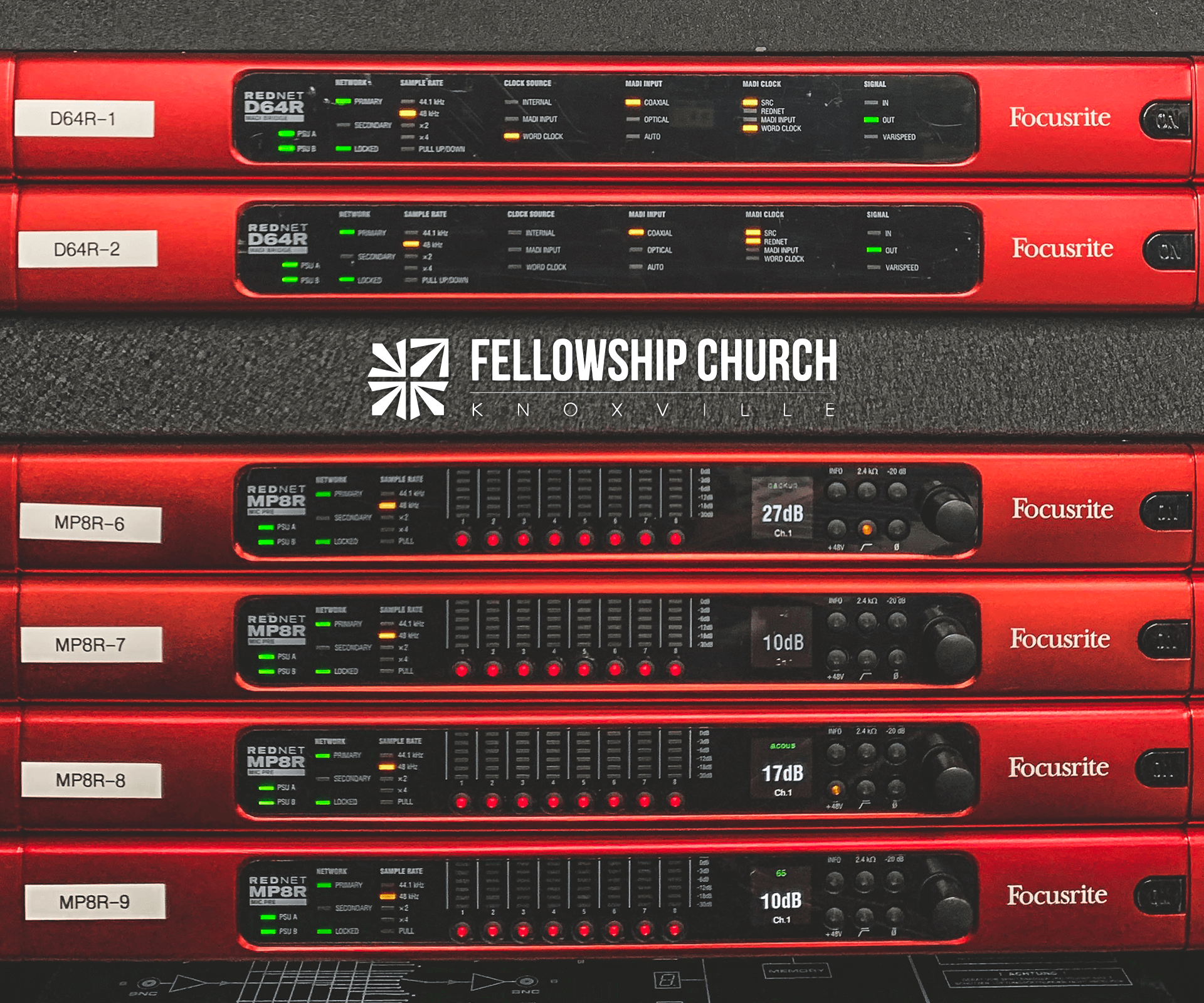 Fellowship Church Knoxville, a four-campus church in east Tennessee, was an early adopter of AoIP technology. The opportunity came for an upgrade to the system, which its main campus in Knoxville, TN, got over the summer with the addition of several components from Focusrite's RedNet range of Dante™-networked audio converters and interfaces, including seven RedNet MP8R eight-channel mic pre and A/D converters and two RedNet D64R 64-channel MADI bridges.