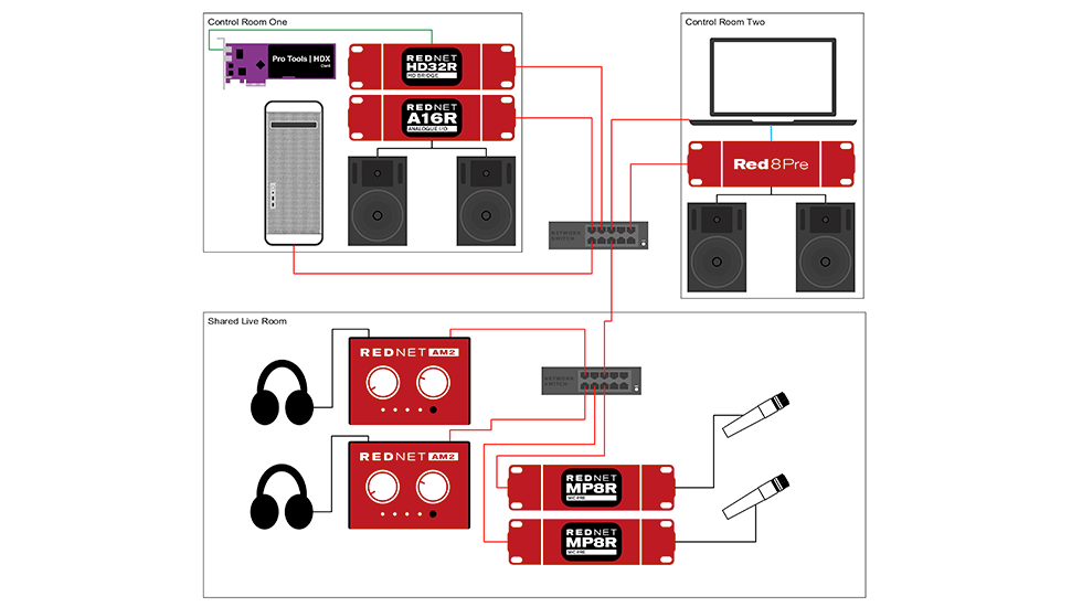 The biggest unique advantage of Ethernet audio, however, is its scalability. In practical terms, the other standards described above are only useful for simple setups where a single audio interface is exchanging data with a single computer. In an Ethernet network, however, there is almost no limit on how many devices can be connected. Multiple computers on a network can access the data from a single audio interface, or a single computer can simultaneously record audio from multiple interfaces in different live rooms. If we need more headphone outputs in the middle of a session, we can simply plug additional Dante or AVB-enabled headphone amps into the network.