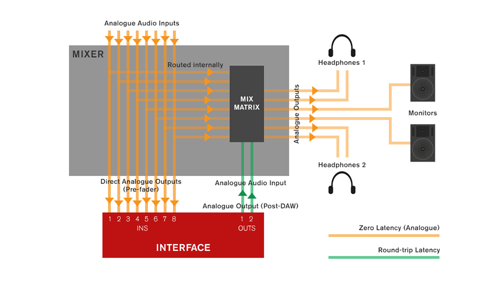 A block diagram showing input signals routed through an external mixer to set up a zero-latency monitoring path.