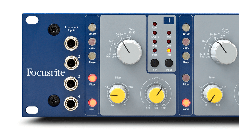 Focusrite’s ISA preamp design combines a very wide gain range with the ability to set gain very precisely, thanks to its use of a separate stepped control (grey, top) and fine trim control (yellow, bottom).